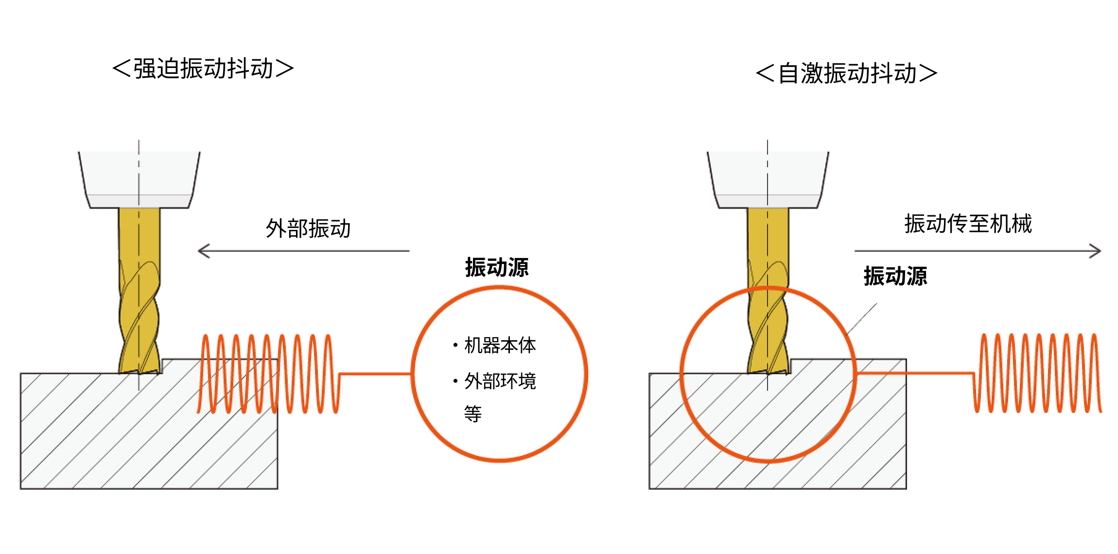 自激振动抖动是以刀具和工件的加工点作为振动源的振动抖动。由切削抵抗引起的小振动会因机器的振动特性而被放大,也称为再生振动抖动。